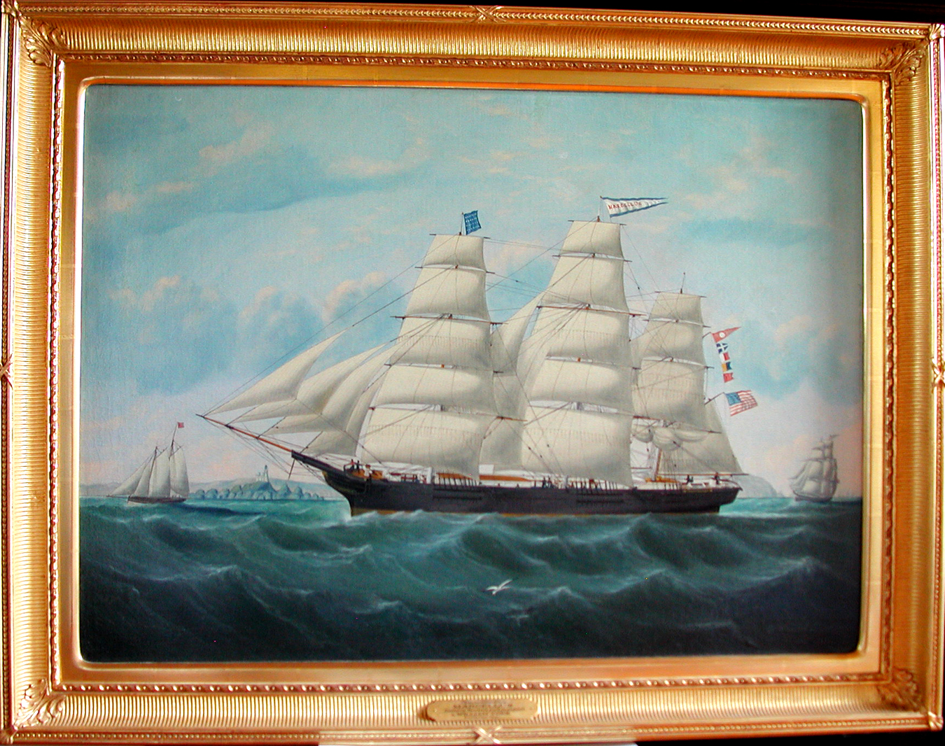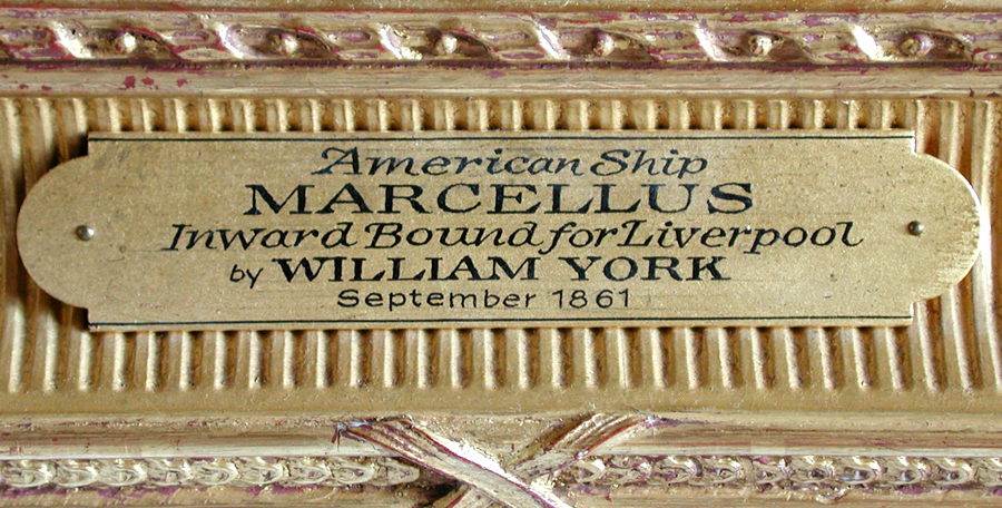 PORT VIEW OF THE AMERICAN SHIP MARCELLUS OFF LIVERPOOL. Oil on canvas. 26" x 36" plus a very fine, 4" wide, gilt frame. Signed lower right "Wm York Lpool/Sep 1861". The Marcellus was built at Medford, MA in 1848. Her homeport was Boston, MA. Condition lined and excellent. Has old Kennedy Galleries labels affixed to the back of the stretcher. Has hand lettered gilt information tablet on the frame.