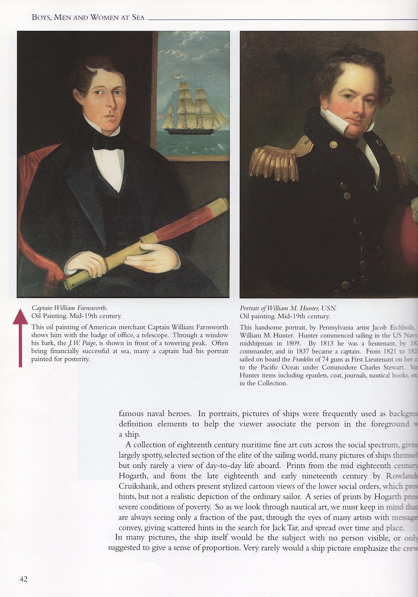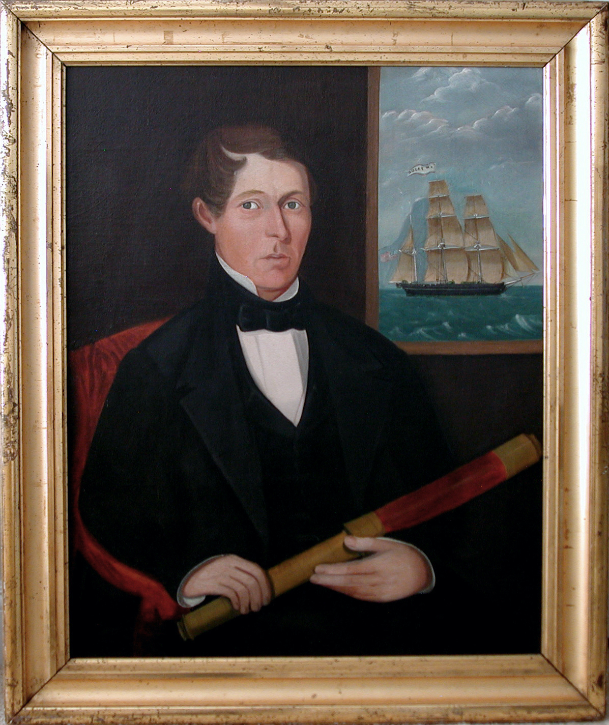 LARGE PORTRAIT OF A 19TH CENTURY AMERICAN SEA CAPTAIN. Very desirable image that shows the young captain holding his wood barrel spyglass with a portrait of his vessel in the background. The vessel flies an American flag and a banner with the name of the bark "J.W. Paige". Oil on canvas. 36" x 29" plus a 4" wide antique, lemon gold, frame. Condition lined and excellent. Identified as Captain William Farnsworth of Rockland, Maine. Attributed to the Baltimore artist William Hare(1815-1865). From the collection of J. Wells Henderson and illustrated on page 42 in his book "Marine Art & Antiques JACK TAR A Sailor's Life 1750-1910". Portraits of captains that depict him with his telescope plus a view of an identified American flag flying vessel are quite rare. Overall a most impressive example of its type.