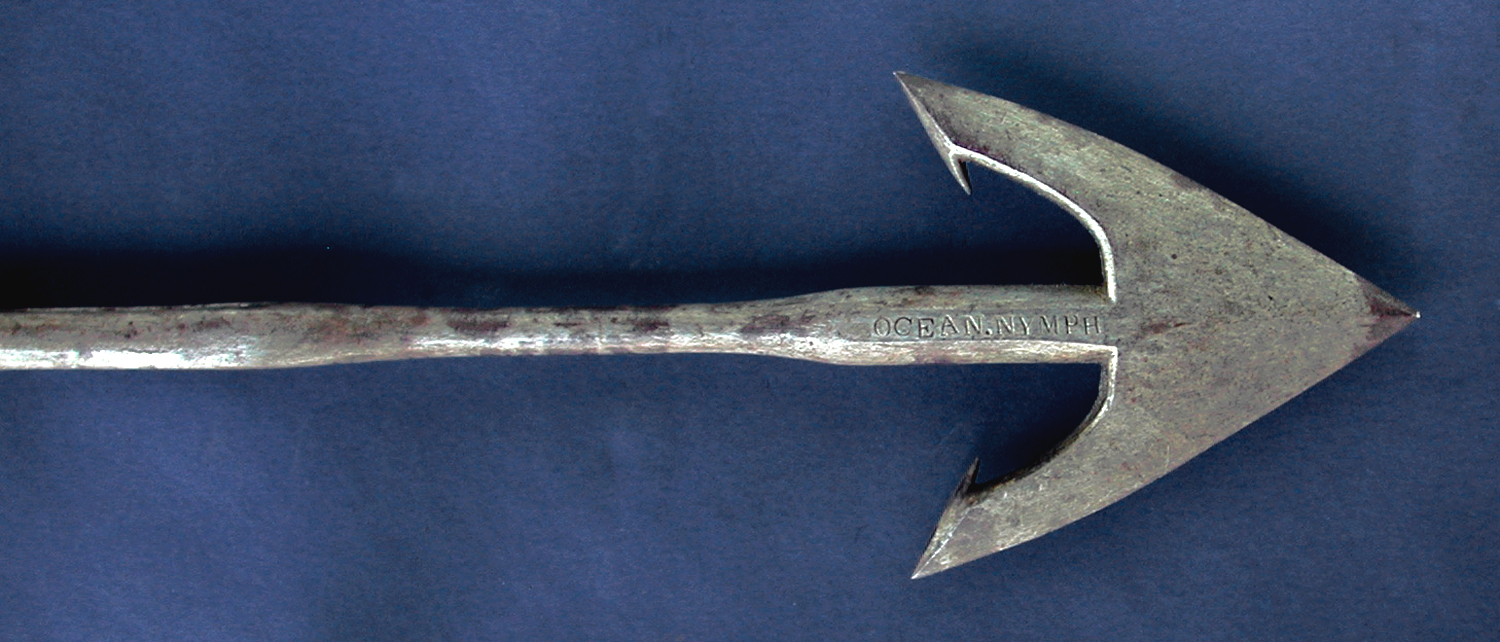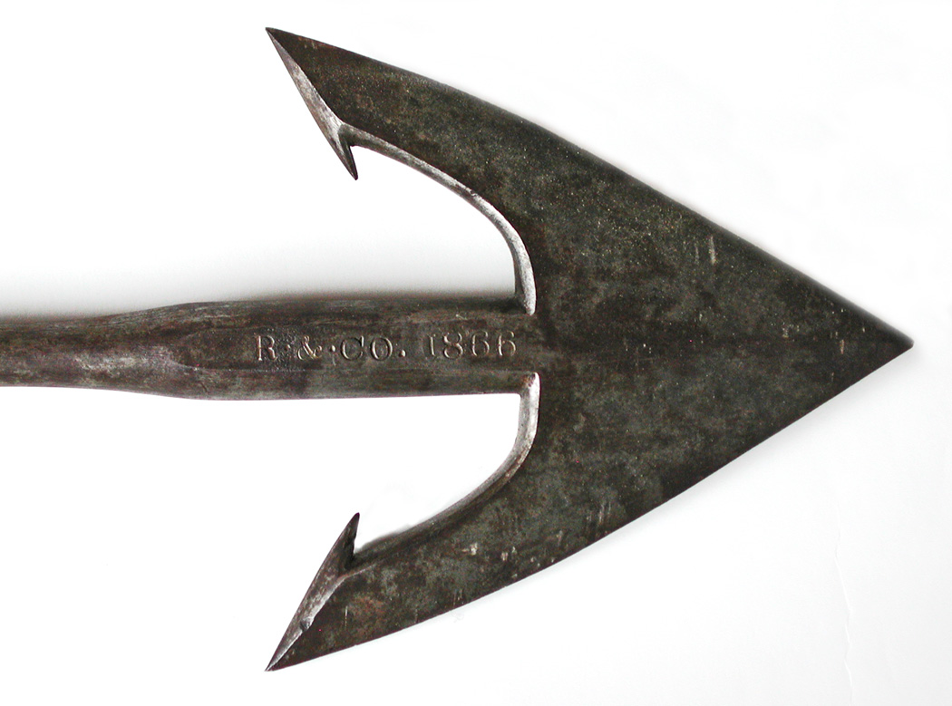 MASSIVE, FULLY MARKED, GREENER GUN HARPOON. 52" long. Two-flued head deep stamped on one side with the vessel name "OCEAN NYMPH". Reverse with maker or owner's marking and date "R & Co. 1866". Condition about mint. From my personal collection.