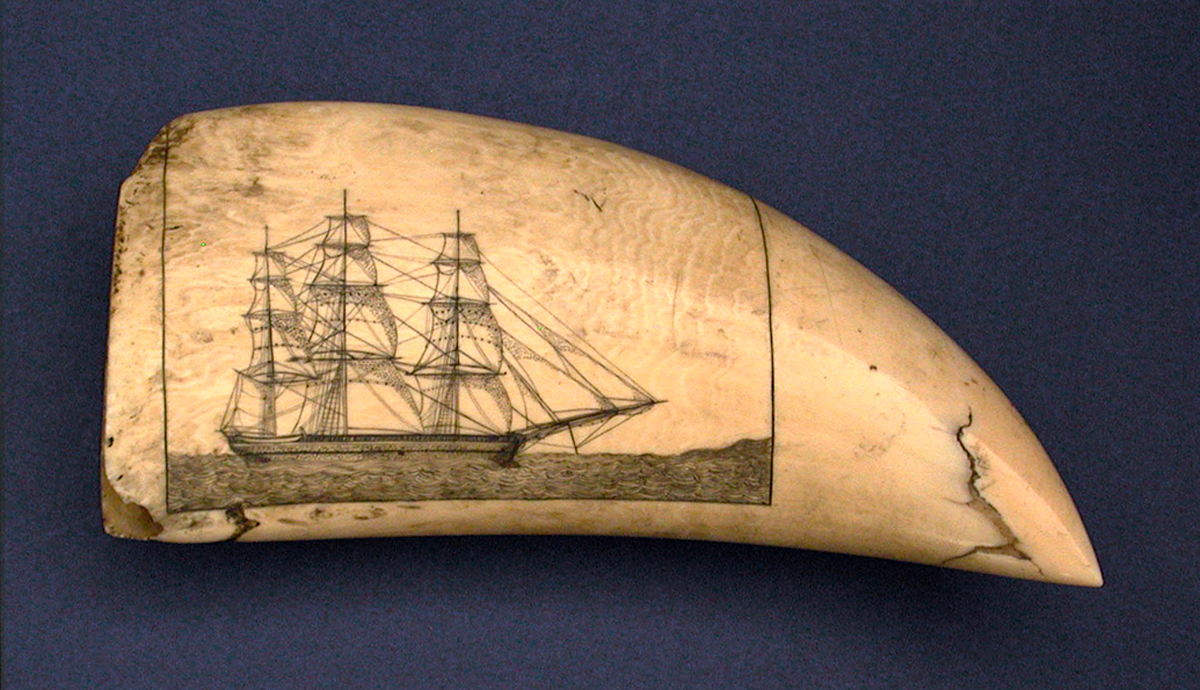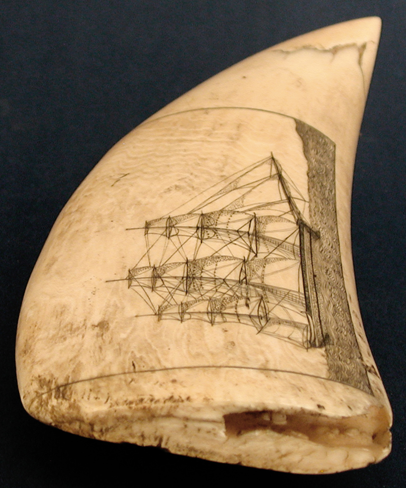 19TH CENTURY SCRIMSHAW CARVED SPERM WHALE TOOTH. One side with a starboard view of a whale ship under full sail approaching a mountainous island. Scene sits within a simple frame. Reverse with a large portrait of an elegantly dressed, seated female holding back a drape with her right hand. Over her left shoulder is a portion of an elaborate column and arch. The engraved work is superb, bold and confidently applied. Almost solid tooth that measures 6 3/4" l. x 3 1/8" w. Condition fine. Desirable age patina throughout. Circa 1840. From my personal collection.