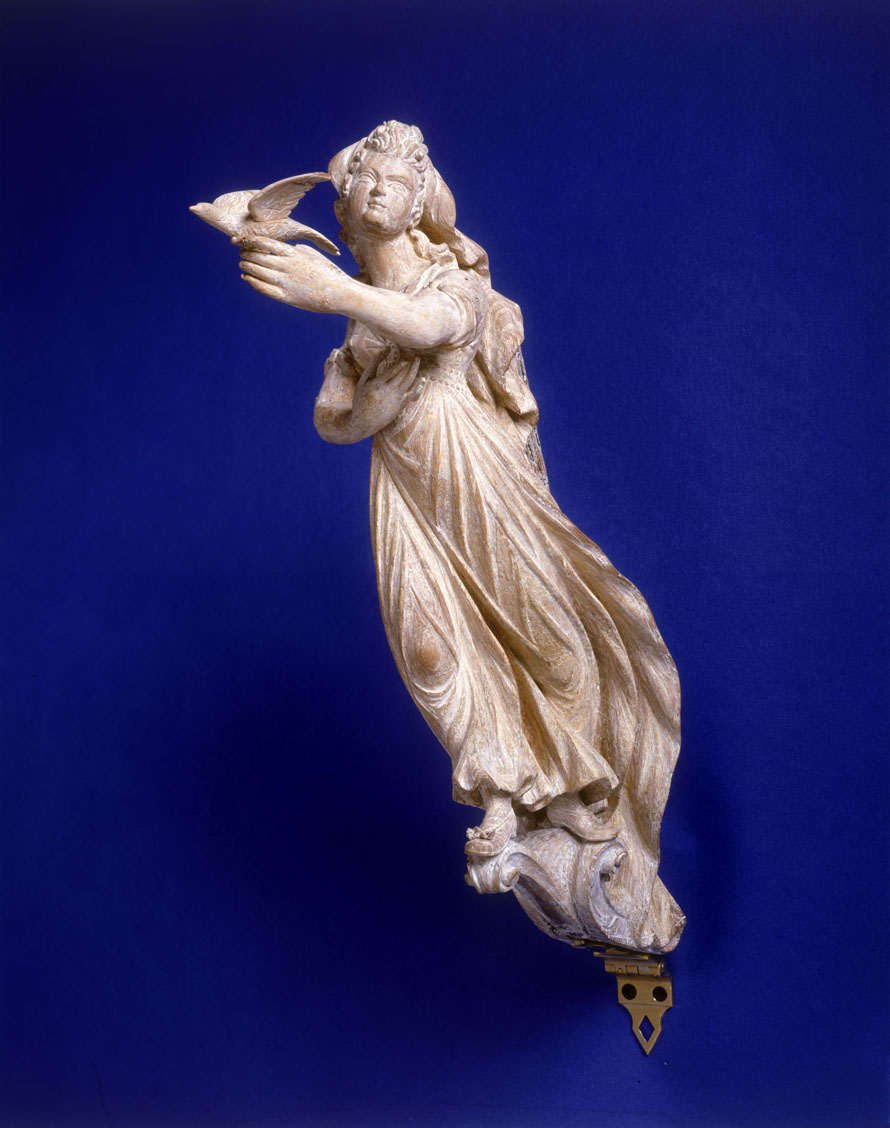 Elegantly carved female holding a bird in her left hand. Likely a model done by a very skilled 19th century ship carver. 18" tall.