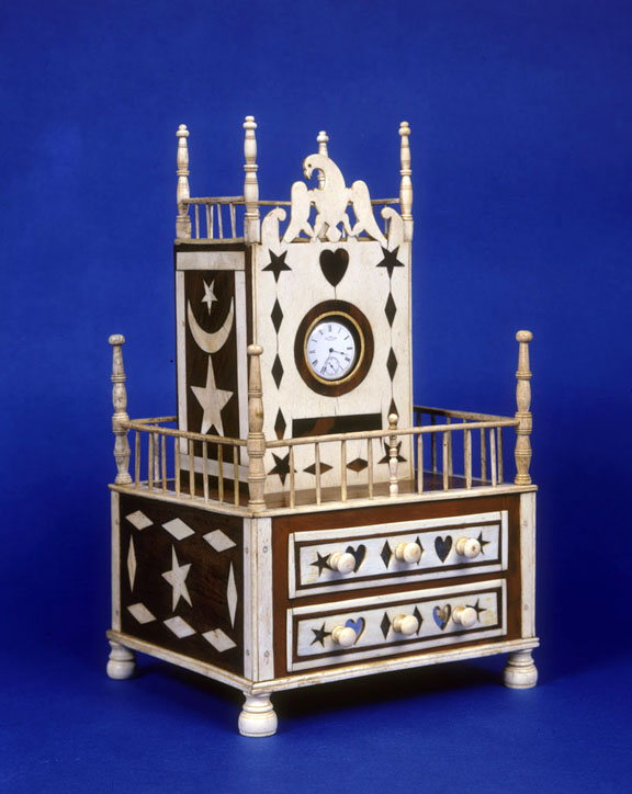 A large and elaborate, 19th century scrimshaw clock tower, made from teak wood that has been trimmed and inset with whalebone and Tortoise shell. Entire upper portion faced with panbone that has been pierce carved at the top forming a silhouette of an American Eagle. Height 15”.