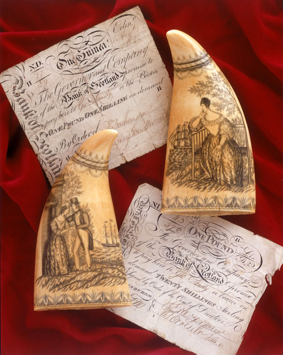 A pair of elaborately engraved scrimshaw teeth by an anonymous 19th century artisan commonly refered to as "The Banknote Engraver". The teeth are displayed with hand-written banknote forgeries made by French prisoners-of-war while incarcerated at the Valleyfield Depot in Scotland. The notes are dated 1810 & 1812.