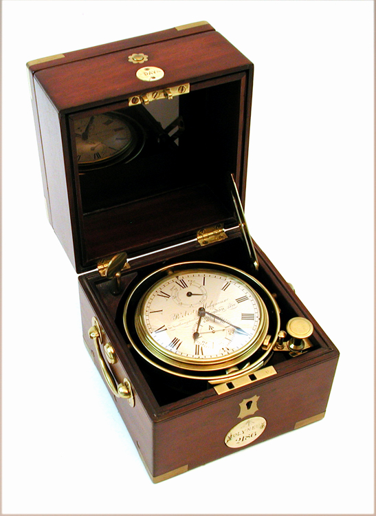 FINE, 19TH CENTURY, MARINE CHRONOMETER WITH ADMIRALTY MARKINGS. The 4" diameter silvered face beautifully script engraved "Robert Molyneux/30 Southampton Row London 2186". Has Admiralty broad arrow within the second hand dial. Blued steel hour, minute, second and up/down hands. Domed glass bezel. Mahogany box with inset brass corners, key escutcheon and ornate top plaque. Brass carrying handles. Front with an ivory disc that is engraved with Admiralty arrow and "Molyneux/2186". Also has a smaller inset ivory disc marked "2 DAYS". Box size 6 1/4". Condition overall very fine. Has an outer storage box that is a later replacement. This chronometer was sent to England in 1978, by my dad, to the famous Thomas Mercer firm for a complete overhaul and rating( all paperwork and correspondence included). The small top lid may be a replacement but I'm not positive. In his book Tony Mercer lists this exact chronometer as being made in 1841 which is probably about right because it's fitted with Molyneux's auxiliary compensation balance which he patented in 1840. An important marine chronometer and especially nice with the broad arrow mark denoting acceptance and use by the British Royal Navy.