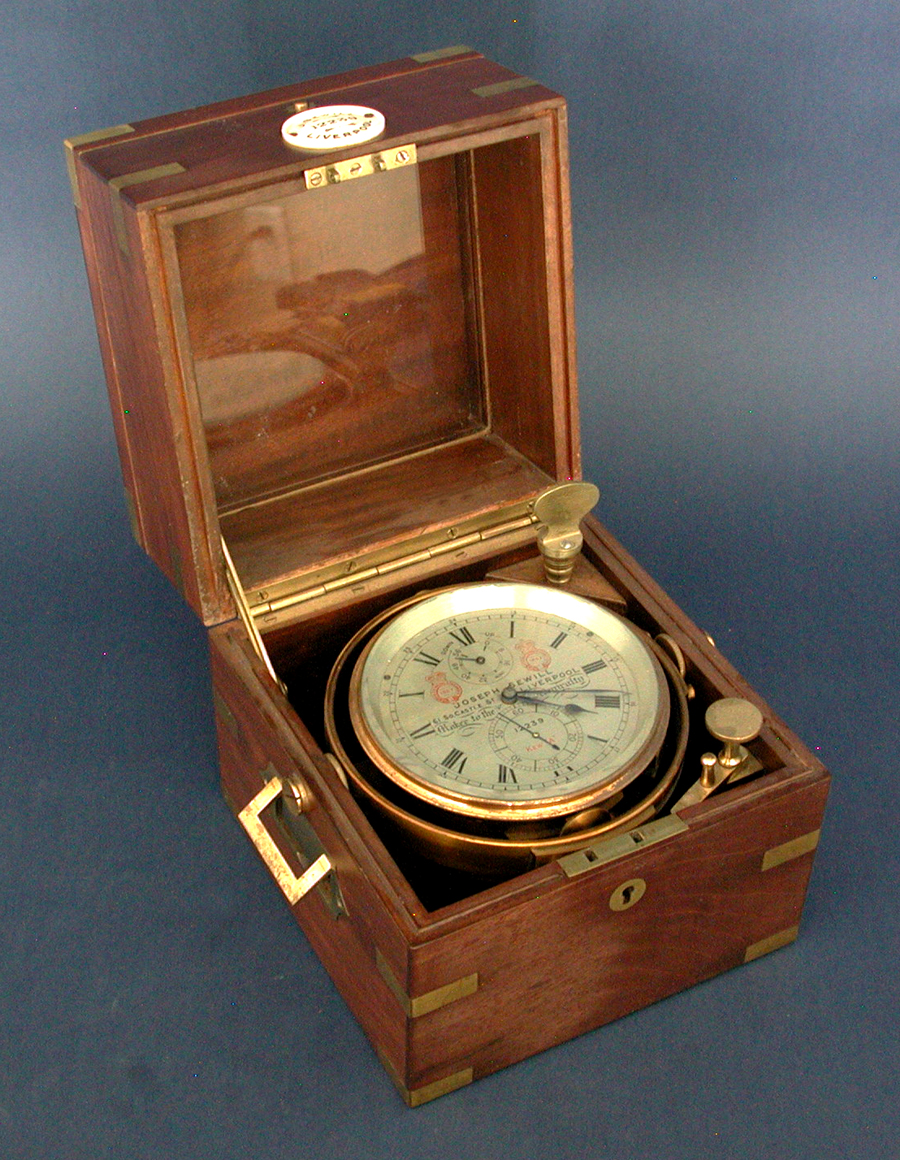 SHIP'S CHRONOMETER fully signed on the 4 1/2" diameter silvered dial "JOSEPH SEWILL/61 So. Castle St. Liverpool/Maker to the Admiralty". 56 hour. On either side of the up/down dial are crown devices with info "Prize Medal Awarded 1867/International Exhibition 1862". Within the second hand dial is serial number "12239" and "KEW A" which denotes a class A certificate for performance and accuracy. Roman numerals with 24 hour scale on outer edge of the dial. Blued steel hour, minute, second and up/down hands. Brass gimbal, bowl and locking device all retaining most of their original lacquer finish. Brass bound mahogany box, 7 1/4" x 7 1/4" x 7 3/8" high. Flush mounted brass carrying handles, 2 front escutcheons and a circular ivory plaque engraved "J. SEWILL/12239/ LIVERPOOL". Condition of everything excellent noting that the small top lid with inset brass corners was replaced by a professional clock cabinetry firm. Outer storage box a later replacement. The Sewill firm had a long history of being makers of high quality and very accurate instruments. Very handsome marine timepiece.