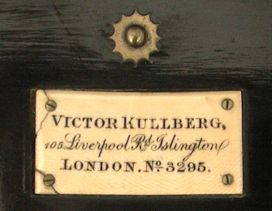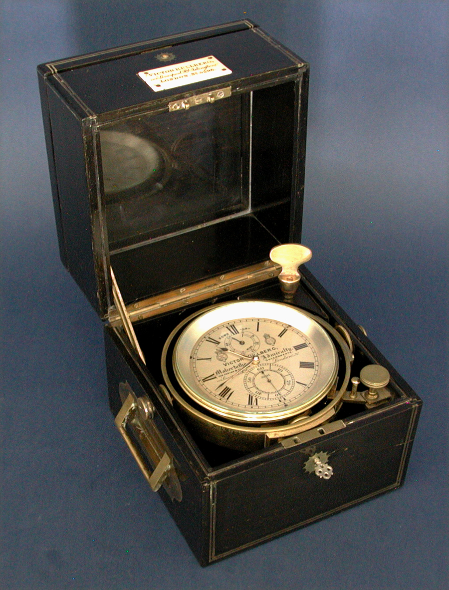 SUPERB MARINE CHRONOMETER BY VICTOR KULLBERG. Beautiful instrument mounted in a gabon ebony box that is decorated with thin brass double stringing, inset brass handles, fancy escutcheons and an ivory plaque engraved "VICTOR KULLBERG/105 Liverpool Rd Islington/LONDON. No 3295". 4 1/4" diameter silver dial profusely engraved "VICTOR KULLBERG/Maker to the Admiralty/The Indian & Italian Governments/105 Liverpool Rd. London N". To the left of the up/down dial is a crown device with info "To H. M. The King of Sweeden and Norway". To the right another crown device with info "Prize Medals awarded 1860/1862/1864". Engraved around the second dial "Five Gold Medals Awarded/Diploma of Honor, Sole & Highest Award/Vienna". Serial number "3295". Roman numerals. Gold hour and minute hands. Blued steel second and up/down hands. 56 hour. Brass gimbal, locking device and bowl. Early form of balance that is, in principal, a modification of Molyneux's third form but has an important advantage in that the secondary rims, instead of being separately made and attached, are cut out of the tail ends of the main rims themselves resulting in a stronger form. Condition excellent noting that the small top lid and its brass stringing is professionally replaced, using the correct wood, by a clock cabinet maker. Also has a wood outer storage box that is from a later period. Condition excellent. Keeps accurate time. Victor Kullberg's workmanship is always of the highest quality. This chronometer, #3295" was made in 1875. A very eye catching maritime instrument.