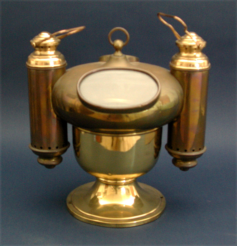 ALL BRASS YACHT BINNACLE with the compass signed "Baker Compass Co/Melrose Mass. U.S.A./Estab 1872/quick & steady". Also marked "The Harris Co/Portland, ME". Brass pedestal, compass housing and bonnet with original oil side lights. Overall height 15" x 14" maximum width. Removable, twist and lift, top with two glass windows and a carrying handle. Overall condition excellent noting one tiny stress crack in one of the brass side lights. Late 19th century. A handsome piece of nautical gear.