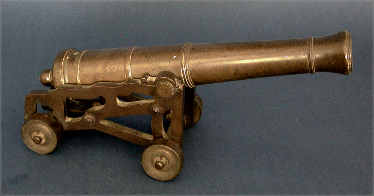 BEAUTIFUL, PROFESSIONALLY MADE, SALUTING CANNON signed by the maker around the breech ring "PARKER FIELD & SONS 233 HIGH HOLBORN LONDON". Classic naval barrel with all the details including muzzle moulding and astragal, first and second reinforcement rings, vent fold and touch hole, etc. Heavy, all bronze, construction including the carriage and four wheels. Weighs just a bit under 5 lbs. Condition excellent noting a few very minor bruises in the cascable/breech area. Everything with desirable deep bronze patina(much darker than our photo). Barrel length 10 3/4". Maximum diameter 2". The firm Parker, Fields & Sons were at the 233 High Holborn address from 1841-1876.