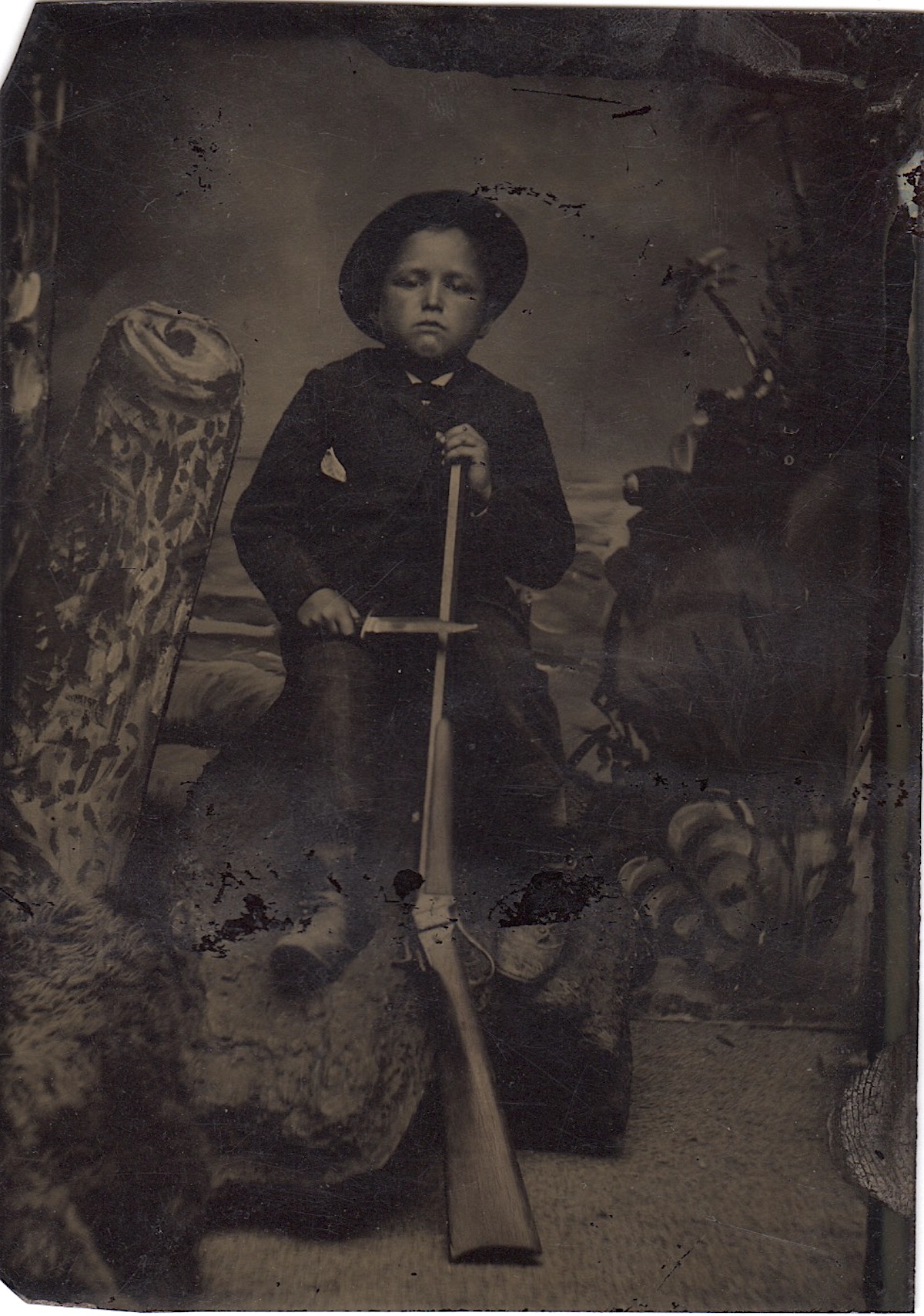TINTYPE IMAGE of a young, well dressed, Indian boy posing within a studio background. In his right hand he holds a clip point Bowie knife while his left hand holds the barrel of a Sharps rifle that stands between his legs. Height 3 1/2" x 2 1/2" wide. Nice clear image that's in overall good condition. Desirable subject matter.