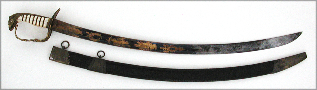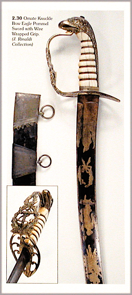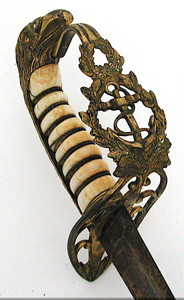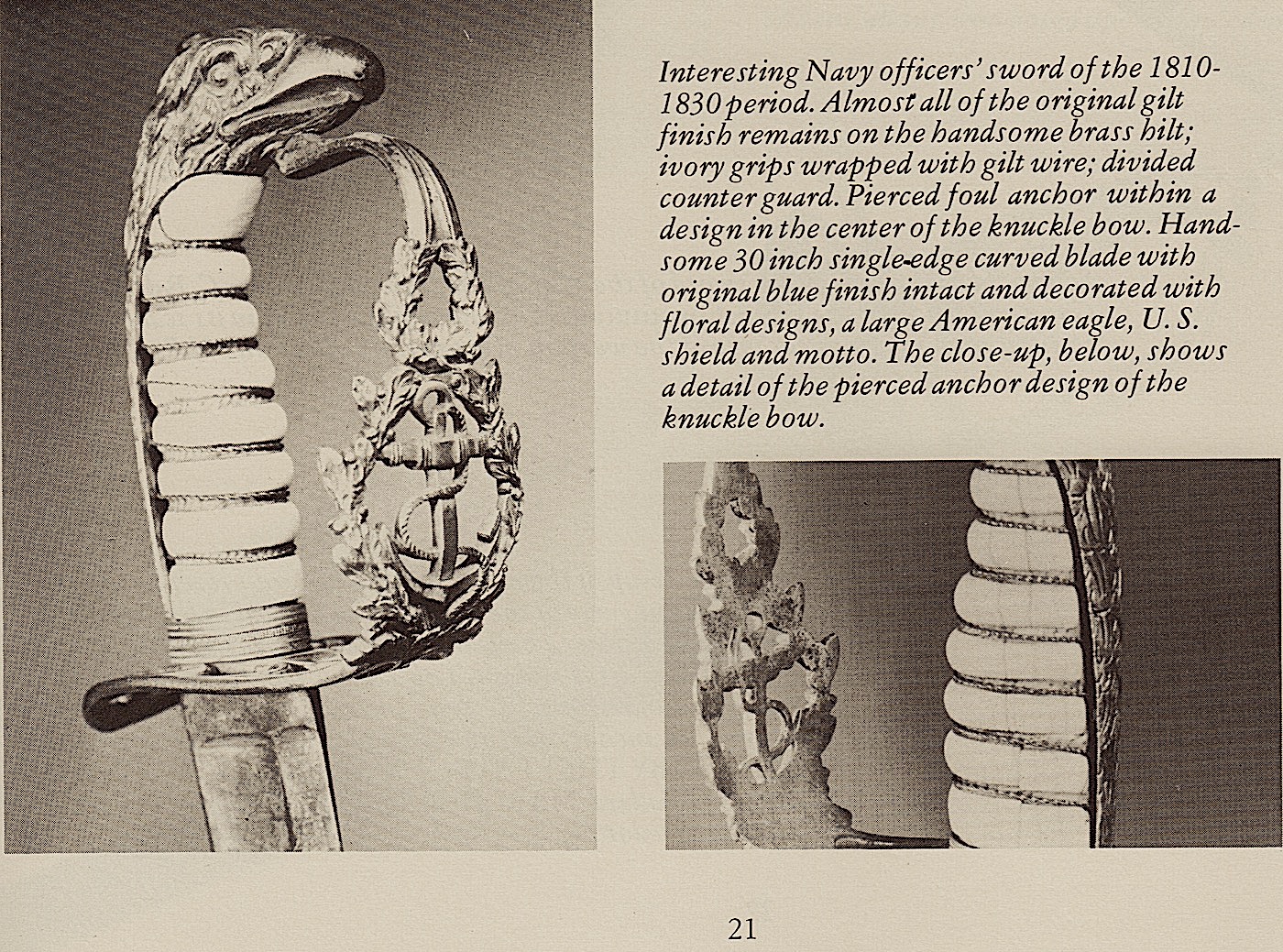 ORNATE EAGLE POMMEL SWORD with a pierced, fouled anchor, motif in the knuckle bow. Circa 1820-30. Curved blade measures 19 1/2" l. x 1 3/8" w. Both sides decorated with blue and gilt designs that include an American Eagle, pole and cap, Lady Liberty and other foliate designs. Ivory grip with wire wrapping. Nice bold Eagle head pommel with feather motif back strap. Original leather scabbard with three brass mounts and two carrying rings. Overall condition quite good. Rare handle form and very unusual to find with its scabbard. Illustrated and discussed on the dust jacket and page 27 in Peter Tuite's book "U.S. Naval Officers Their Swords and Dirks". Also illustrated on page 21 in Rankin's book "Small Arms of the Sea Services".