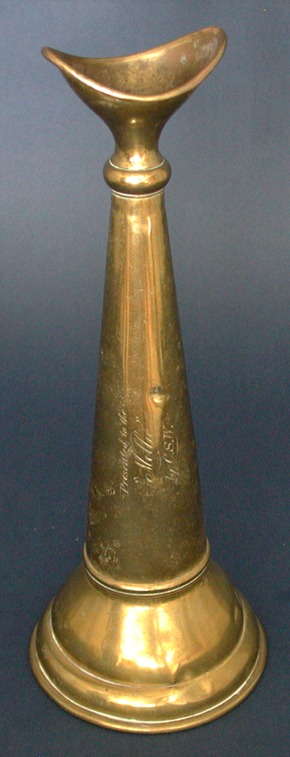 ALL BRASS SPEAKING TRUMPET ENGRAVED with inscription "Presented to the/Mollie/by C. S. W". 12" tall. Bottom diameter 4 1/2". Condition sound but with typical scattered dents that could be massaged out if so desired. The Mollie was likely a 19th century sailing yacht. Illustrated on page 134 in Klamkin's "Marine Antiques". Ex collection Norm Flayderman.