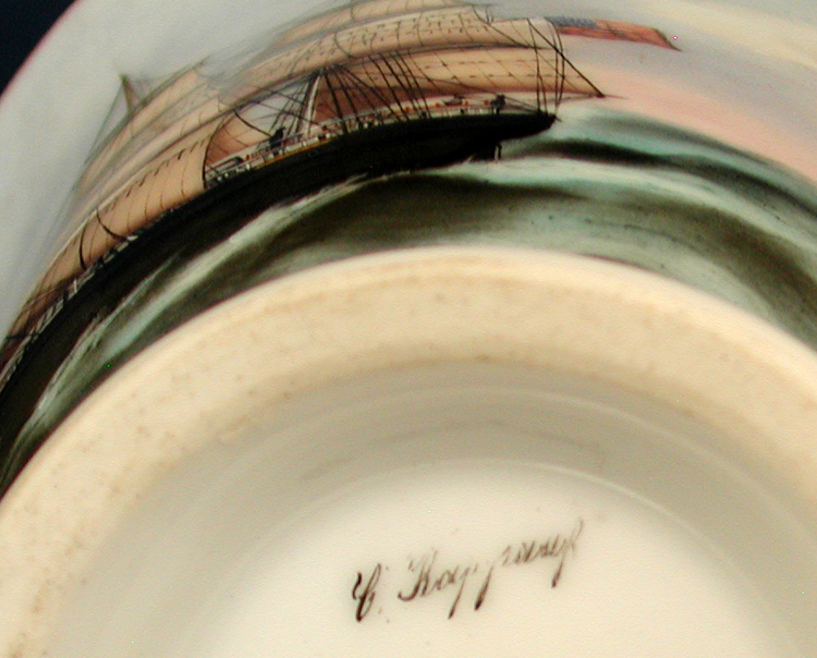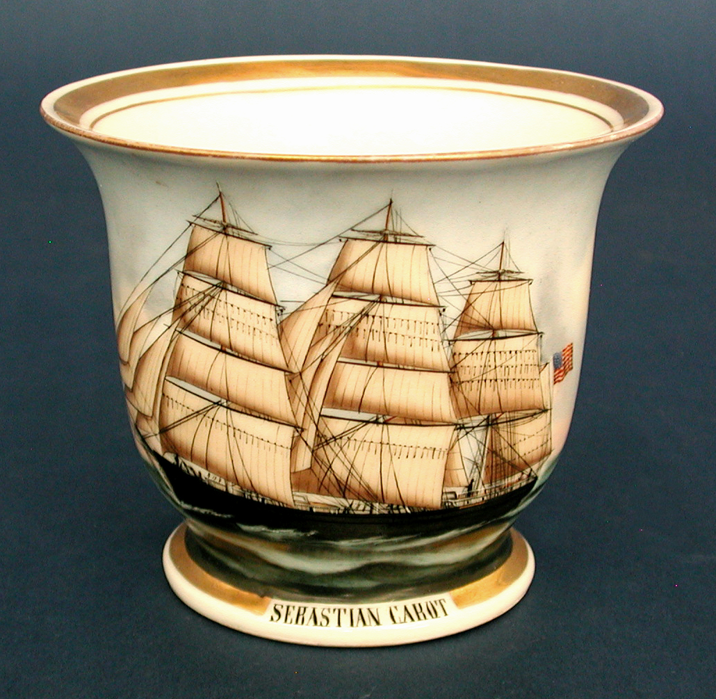 BEAUTIFULLY PAINTED SHIP PORTRAIT BY A GERMAN ARTIST. Executed on a white porcelain teacup. Depicts a gilt bordered port view of the vessel under full sail. The vessel's name, "SEBASTIAN CABOT", applied below the water. Artist's signature on the underside "C. Kappauf". Popular items commissioned by 19th century sea captains who visited the Port of Hamburg, Germany. Condition overall excellent. 3 3/4" tall x 4 1/2" diameter. The ship was built in 1854 at Thomaston, Maine and was undoubtedly named after the explorer and cartographer Sebastian Cabot. One of a small grouping of this unique form of ship portraiture that I assembled over several decades.