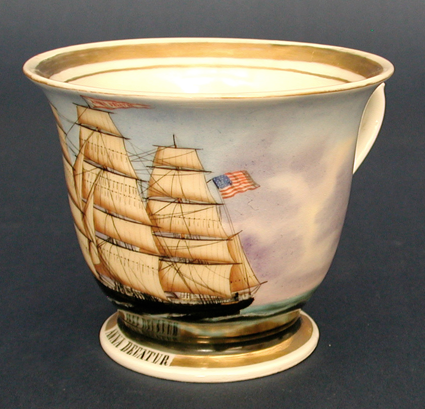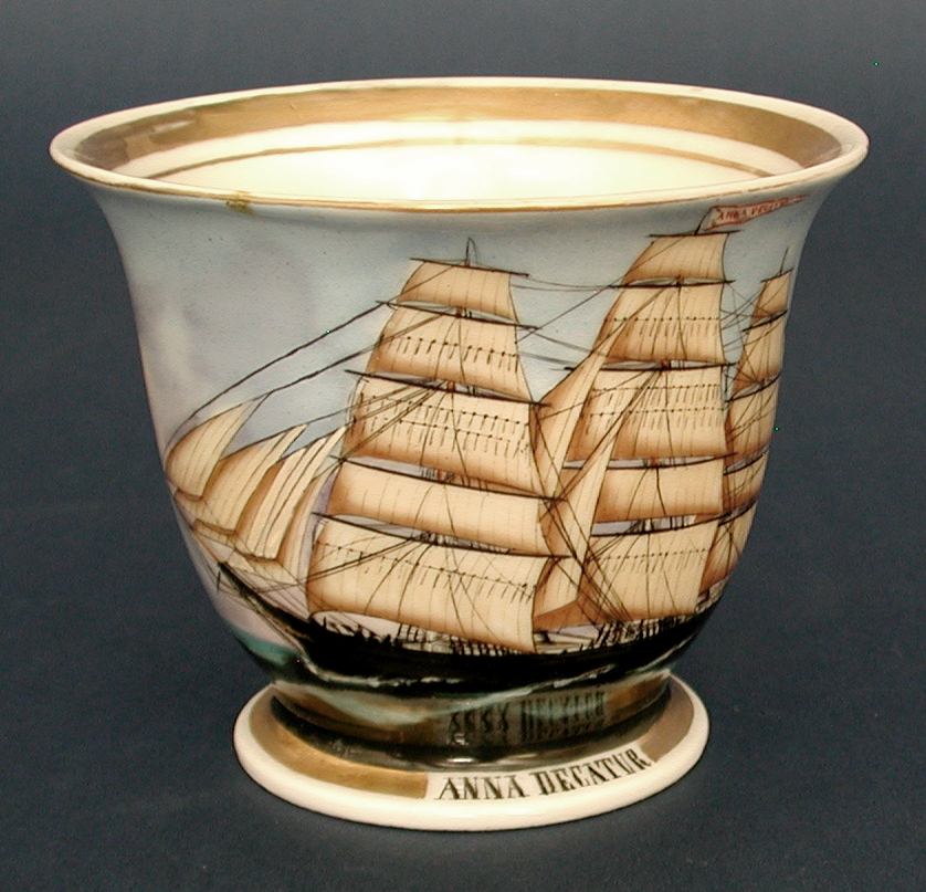 SHIP PORTRAIT PAINTED ON A PORCELAIN TEACUP. These little gems were commissioned by 19th century ship captains while they were in the Port of Hamburg, Germany. Beautifully executed port view of the ship under full sail. Below and on the mast pennant is vessel name "ANNA DECATUR". 3 3/4" tall x 4 3/8" diameter. Gilt borders around the painting, rim, base and on the handle. The ship was built in 1856 at Portsmouth, NH. It was named for Anna Decatur of Kittery Point, ME, the wife of Stephen Decatur. Condition excellent. One of a small grouping of this unique form of ship portraiture that I assembled over several decades.
