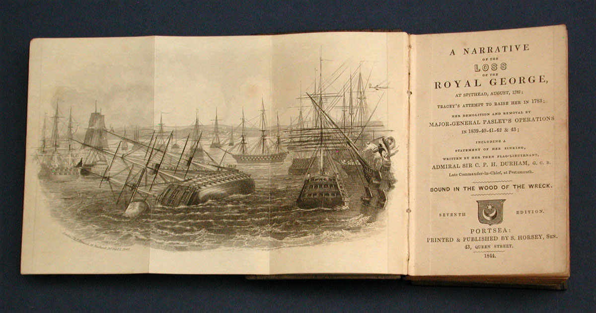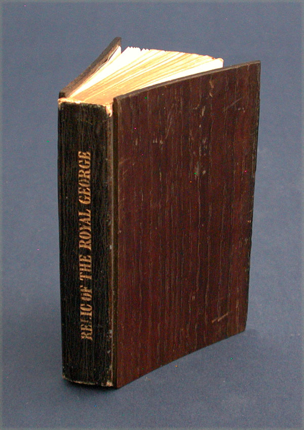 ROYAL GEORGE RELIC....A SMALL BOOK BOUND IN HER TIMBER. 2 3/4" x 4 3/8" with dark oak covers sawn from timbers recovered from Spithead where the vessel sank in 1782. Leather spine with gilt lettering "RELIC OF THE ROYAL GEORGE". 168+ gilt edged pages. Tells detailed story of the loss and recovery efforts of this famous warship. Several fine illustrations including one opposite the title page that folds out and depicts the tragedy happening. Several times at beginning there is mention that the covers are from the vessel's timber. Detailed title page that reads "A NARRATIVE of the LOSS of the ROYAL GEORGE at Spithead, August, 1782...BOUND IN THE WOOD OF THE WRECK....1844". Condition superb throughout. Over the years we've had numerous relics from this vessel including canes, small cannons, etc., all being of superb quality and very collectible. Because it tells the entire story this piece should be the cornerstone of any Royal George collection.