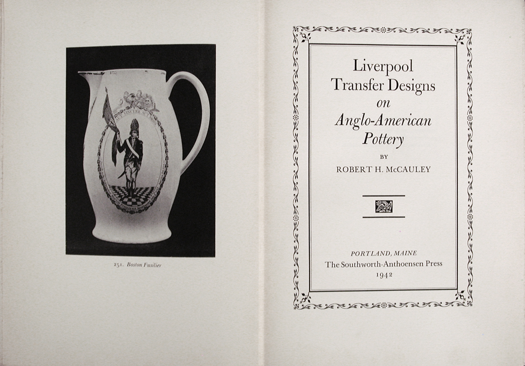 RARE LIVERPOOL POTTERY REFERENCE BOOK. "Liverpool Transfer Designs on Anglo American Pottery" by Robert H. McCauley. 1942. 1 of 500 copies. 150 pages. Over 100 b & w illustrations. Green hardcovers. Early bible for Liverpool collectors. Very good condition. Scarce book.