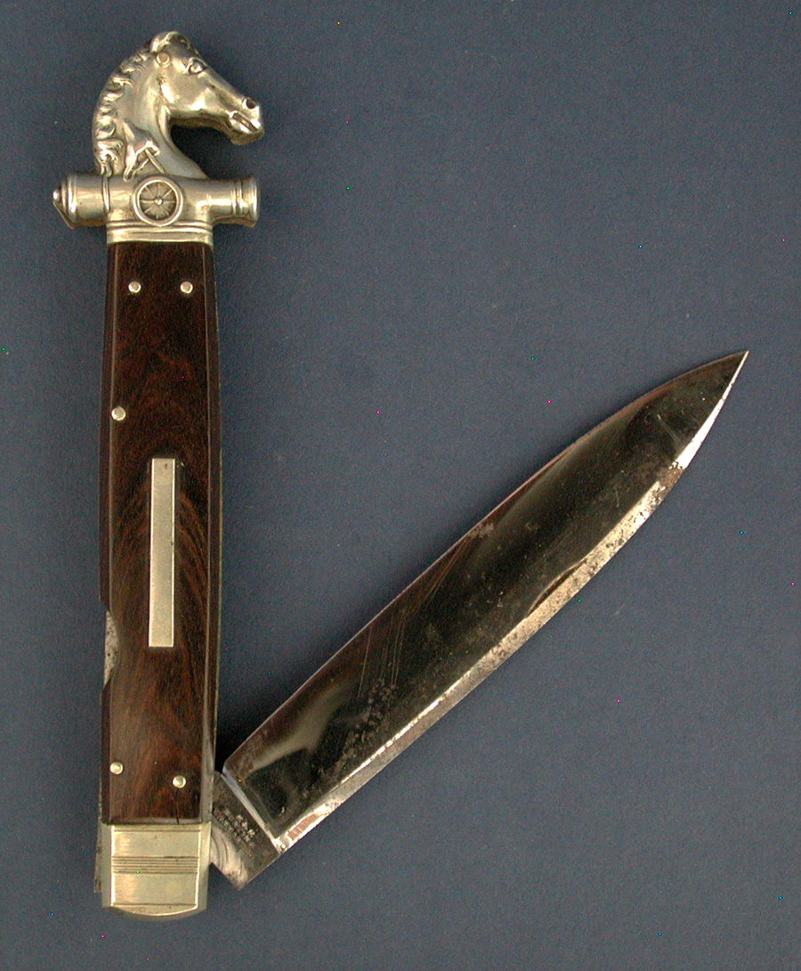 FINE FOLDING KNIFE WITH HORSEHEAD AND CANNON BARREL POMMEL that has a fouled anchor on one side and a pole and Liberty cap on the other. Rosewood slab handle with german silver escutcheon plate and 5 proud assembly pins. Signed by the maker on the 4 7/8" blade "R. & R./BUNTING/WARRANTEED". Length open 10 1/2". Overall condition near mint with blade retaining most all if its original bright polished finish. Robert Bunting began his business in Sheffield around 1825 and in 1841 his son Richard joined the firm. Robert died in 1850 at which time the business passed to his son. A beautiful quality and most attractive, 19th century, Sheffield knife.