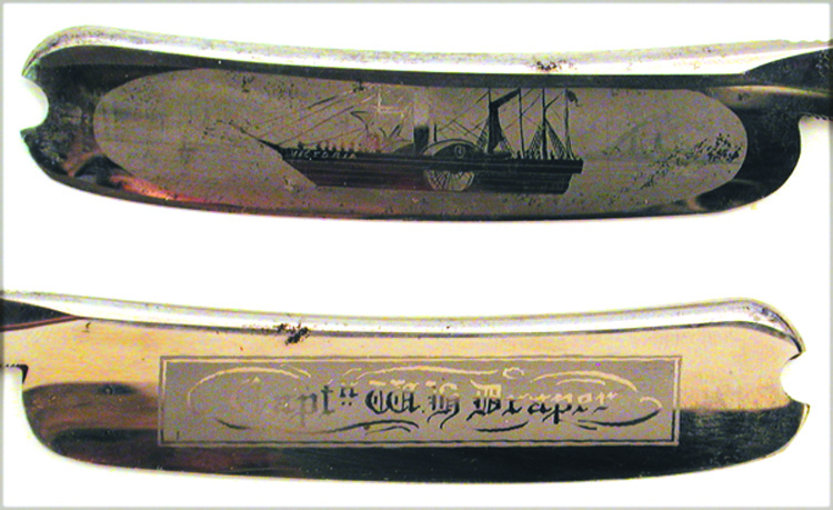 ELEGANT CASED SET OF STRAIGHT RAZORS WITH CAPTAIN AND VESSEL NAMES. Each fitted with meticulously carved ivory handles that are decorated with proud silver pins. The 5 3/4" long blades are etched one side with port view of paddle steamship "VICTORIA". Reverse of each etched within frosty panels with the name "Captain W. H. Draper". Blades also stamped with a crown over "WR" and maker's name "Joseph Rodgers & Sons/Cutler's to Their Majesties/No 6 Norfolk Street/Sheffield". Overall length when open 10". Original maroon leather storage case with red velvet interior. Condition near mint noting one small, expertly done, repair to the very tip of one of the ivory slab handles. This exact pair of razors illustrated on page 374 in Norm Flayderman's book "The Bowie Knife Unsheathing an American Legend". Beautiful quality throughout. The vessel and captain were known on the Britain to Australia route, circa 1855.