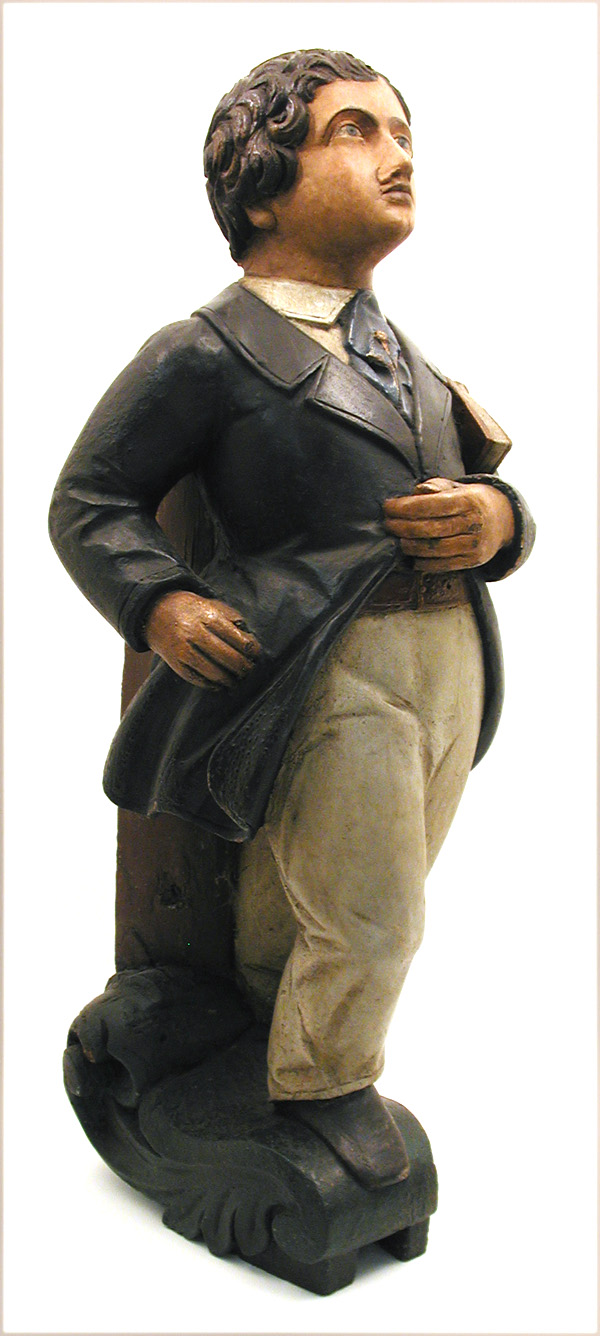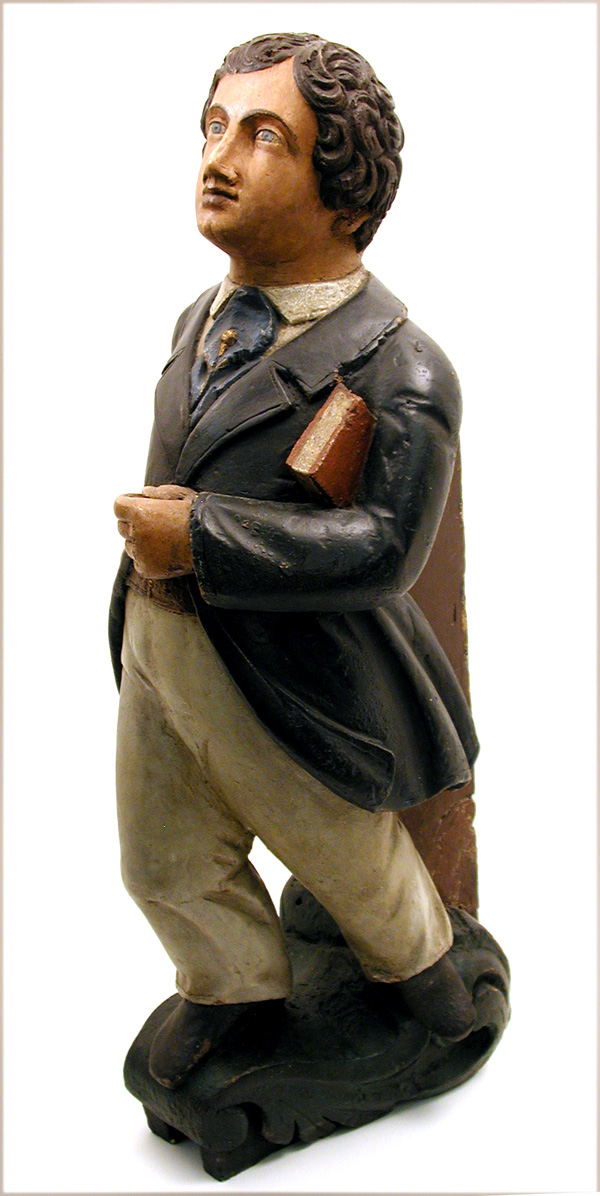 WONDERFUL, 19TH CENTURY, CARVED FIGUREHEAD DEPICTING A YOUNG MIDSHIPMAN. Very nicely carved in a very displayable size measuring 36" tall. Excellent surface being a mix of original and old touch up paint in very pleasing colors. He wears a deep blue, 3/4 length, jacket, white pants, and a collared white shirt with a blue kerchief and gilt pin. His right arm and hand are at his side and tucked under his left arm is a book that likely depicts a navigational log which midshipmen were expected to keep. He stands on a portion of scroll and leaf carving where the figure attached to the vessel. Condition overall excellent. Paint all nicely age mellowed. A most delightful portrayal of a handsome young sailor. Unusual subject matter in figurehead carving.