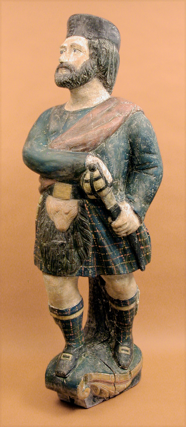 19TH CENTURY SHIP'S FIGUREHEAD carved in the form of a full standing Scottish Highlander. Nice displayable size measuring 48" tall. Very handsome, high quality, depiction of a bearded male highlander dressed in his traditional outfit. Well detailed with great attention paid to all parts of his costume. He wears a dark green plaid kilt with a fur and animal head sporran on the front. His right hand is in position to draw his basket hilt sword from its scabbard. On his right side he wears a dirk knife. His tall tartan socks are held up with garters that are tied off with decorative bows. He wears black shoes with square buckles. He stands on a base that is decorated both sides with classic scroll carving. The paint is not original but was done some time ago using a very pleasant pallet of colors. Condition overall excellent. Circa 1860.
