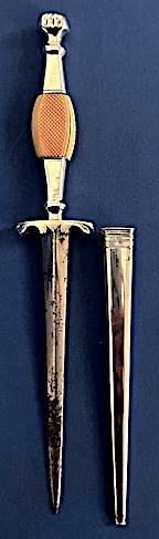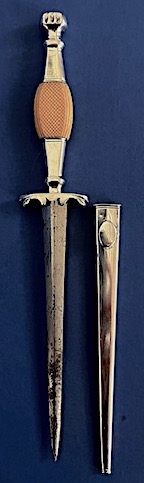 AMERICAN NAVAL DIRK commonly referred to as "The Baltimore Style". Circa 1820. First one of this style dirk that I've had in a very long time and the only I've owned with the checkered and grooved ivory section in the handle. Silver handle with grooved, mushroom shaped, pommel. Elegantly designed cross guard with engraved leaf designs on each corner. 1/2" x 5" steel, diamond shaped, blade. All silver scabbard with an oval frog stud and engraved designs at the top. Overall length 8 7/8". Condition overall very fine. Blade with some pitting toward the tip but also retains some original bright polish on its upper area. Examples of this style dirk appear on page 220 in Peter Tuite's book "U. S. Naval Officers, Their Swords and Dirks". Also on page 61 in Rankin's "Small Arms of the Sea Services".