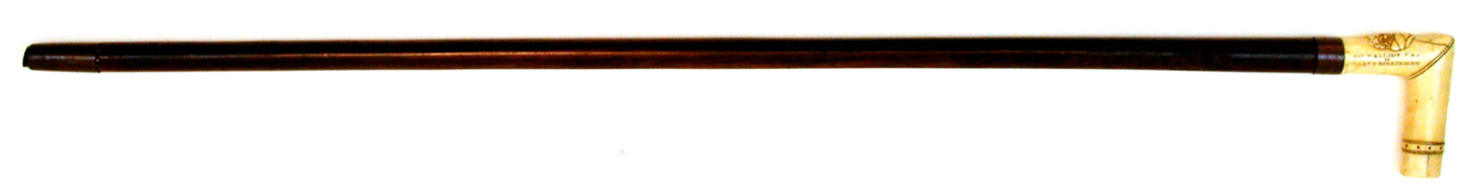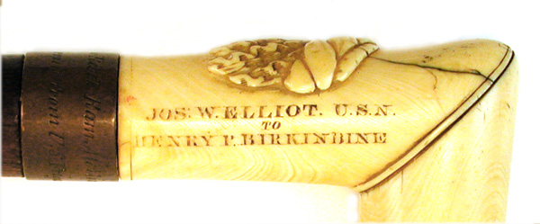 PRESENTATION WALKING STICK MADE FROM FAMOUS AMERICAN VESSELS. L-shaped ivory handle with relief carved head of a man and deep carved inscription "Jos W. Elliott U.S.N./to/Henry P. Birkinbine". All wood shaft probably made from teak that retains its original varnish finish. Copper sleeve where handle and shaft join with engraved information "Band from the Rebel Ram Merrimac/Wood and Ferrule from U.S. Frigate Congress". Overall length 34 1/2". Condition very good. Joseph W. Elliot, USN was Acting 3rd Assistant Engineer May 24, 1864.