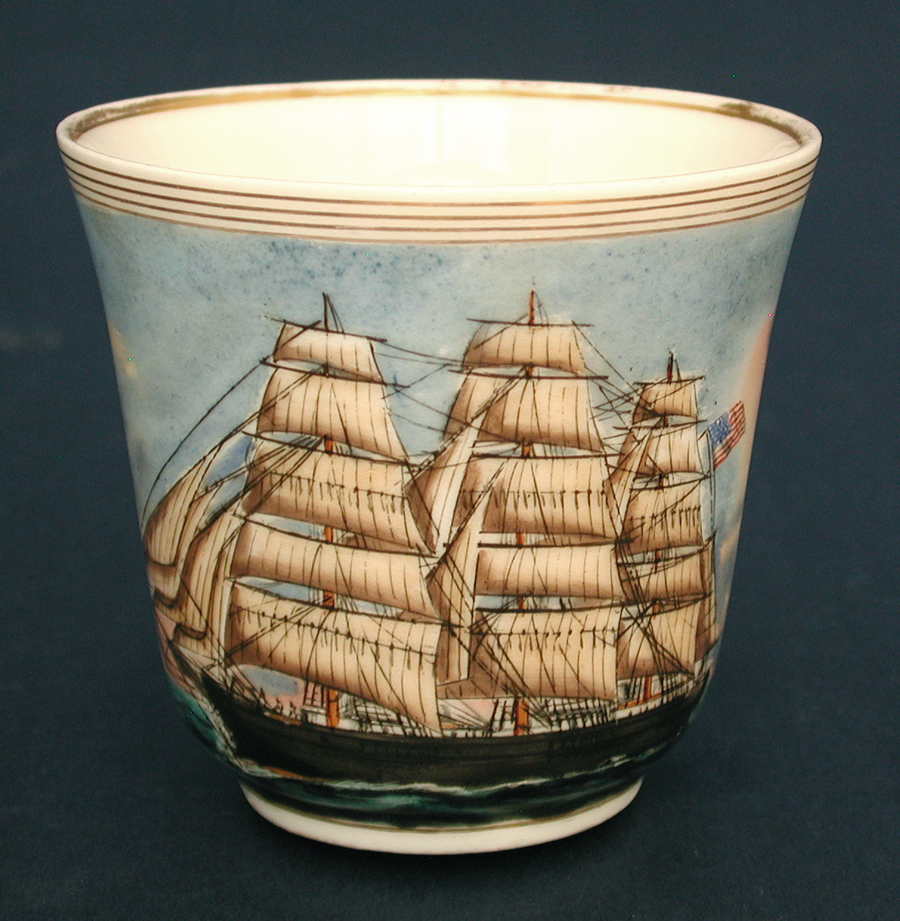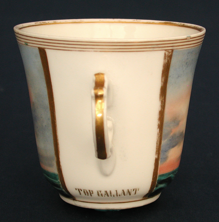 HAND PAINTED SHIP PORTRAIT ON AN UNUSUAL SIZE PORCELAIN TEACUP. Depicted is a port view of the ship under full sail. Under the handle is painted the vessel name "TOP GALLANT". Cup is smaller than typical size encountered measuring just 2 3/4" tall x 3" diameter. Gilt borders around the rim, portrait and on handle. These were commissioned by 19th century sea captains while they were in the Port of Hamburg, Germany. Condition excellent. The vessel was built in 1863 at East Boston, MA. One of a small grouping of this unique form of ship portraiture that I assembled over several decades. Only cup I've ever seen in this size.