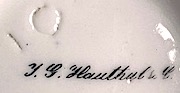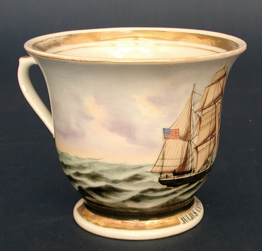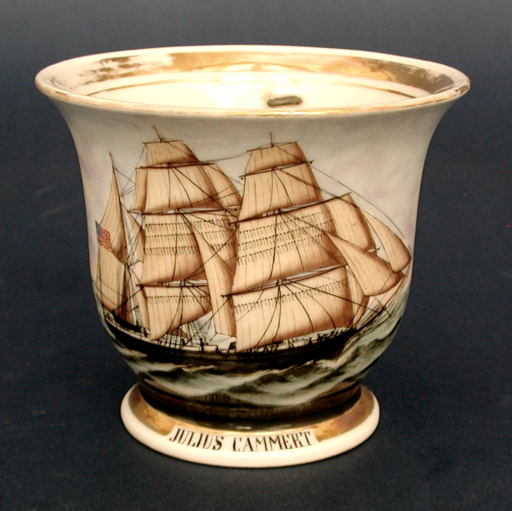 HAND PAINTED PORTRAIT ON THE AMERICAN BARK "JULIUS CAMMERT" OF EASTPORT, MAINE. Done on a white porcelain teacup that is signed on the base with the name of the German porcelain factory "J. G. Hauthal & Co". Depicts a starboard view of the vessel under full sail. Gilt borders around the rim, base, ship portrait and on the handle. Condition very good noting an old mend where the two ends of the handle attach to the cup. This can easily be repaired by a porcelain restorer and would probably be well worth doing. 3 3/4" tall x 4 5/8" diameter. The bark Julius Cammert was built in 1852 at Eastport, ME which was also her homeport. One of a small grouping of this unique form of 19th century ship portraiture that I assembled over several decades.