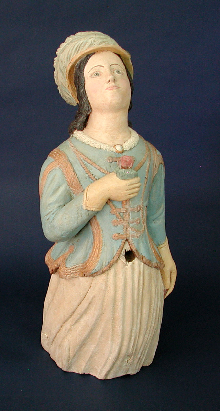 19TH CENTURY SHIP'S FIGUREHEAD depicting a charming representation of a very young girl wearing her female, brass band, attire. She is wearing her very decorative band jacket and a straw hat with a fancy plume on top. In her right hand she holds a flower. 36" high. Excellent condition. Very unusual subject matter. One of a collection of four female figureheads we recently purchased from a collector who acquired most of them in the 1960's. They were repainted over the years using a palette of soft, pastel colors. Richard Hunter, the world's foremost figurehead historian, published an article that featured a figurehead created by this exact carver. The young girl, who Hunter named "Rosebud", looks almost identical to this girl.