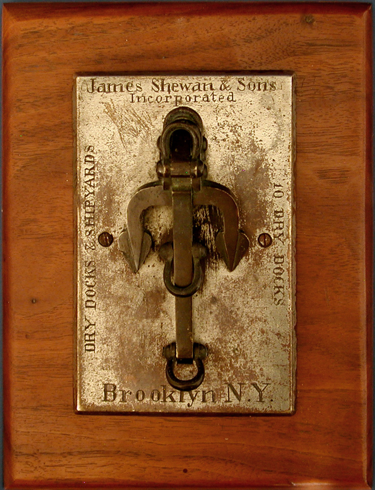 BEAUTIFULLY MADE ADVERTISING PAPERWEIGHT for New York firm that at the time was the largest dry dock firm in America. The flat brass base plate nicely engraved "James Shewan & Sons/Incorporated/Dry Docks & Shipyards/10 Dry Docks/Brooklyn N.Y.". Mounted on the plate is a perfectly made bronze, stockless bower, anchor that is fitted with four pivoting shackles. 3 1/2" w. x 5 3/8" l. Mounted on a 6" x 8" piece of nicely grained mahogany that has softly beveled edges. Overall condition very good noting that there are areas where the original nickel plating is now worn through to the brass. The anchor is perfect and has acquired a most desirable age patina throughout. Circa early 20th century. A very high quality nautical advertising item.