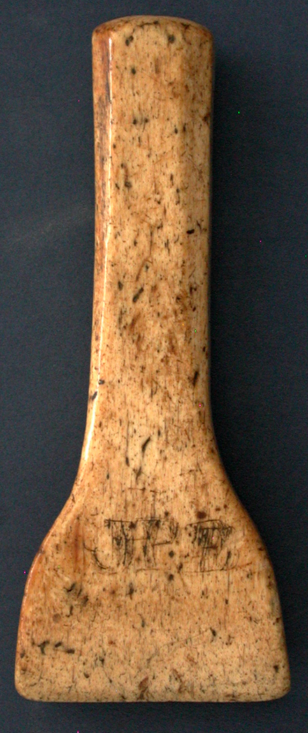 19TH CENTURY SAILMAKER'S SEAMER made from a single piece of whalebone. Simple design but nicely made measuring 5" l. x 2" maximum width. Condition solid and good but does have a few different sets of initials lightly scratched on the handle and blade. Deep yellow age color throughout. Nice example of a real working scrimshaw tool. Circa 1830-40.