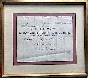 SIGNED BILL/RECEIPT FOR WHALING BOMB LANCES. Pre printed bill from well known New Bedford firm Frank E Brown. Dated "August 12, 1908". For 25 rubber finned lances sold to the "Schooner Cameo & Owner". Neatly hand written and signed by "Frank E. Brown". 6 1/2" x 8 1/4". Nicely matted and fitted into a gold frame. Overall size 11 1/2" x 13". Condition excellent. Nice displayable item for any whaling implement collection.