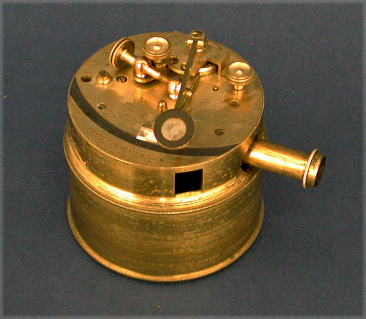 BRASS BOX SEXTANT fully signed below the silver scale "W. & S. Jones Holburn London". 3" diameter. Horizon glass with sun shade that slides into place by using a small lever that's recessed into the side of the brass drum. 2" long index arm fitted with with a sophisticated fine adjusting device. Swing away magnifier. Removable, two draw, optic that can be used in place of a peep site that slides into position by using a lever on the side of the brass drum. Bottom with a sliding door to allow in more light. Threaded removable cover with an engraved scale on the top. Condition overall fine with brass retaining a good deal of its original lacquer finish. William and Samuel Jones began a partnership in 1791 that lasted until 1859 when William died. Their instruments are always highly regarded for their superb quality. Circa 1845.