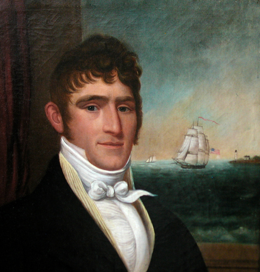 19TH CENTURY PORTRAIT OF A WHALING CAPTAIN. Oil on canvas. 30" x 25" plus a 3.5" wide antique gilt frame. Information passed down with painting identifies the sitter as Captain Clark of New Bedford who sailed to the Pacific on the ship George. The only Captain Clark listed who is affiliated with the George was David Clark who skippered the George from 1847-1853. Beautifully painted depiction of the handsome young captain holding his wood barrel spyglass. In the background is a port view of an American ship sailing around a lighthouse that sits on a point of land. Sailing in the background is a pilot schooner. Condition lined and very good. Another portrait done by the same artist sold in December, 1981 in Part 1 of the Barbara Johnson Collection(lot 48).