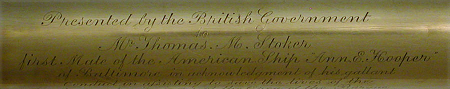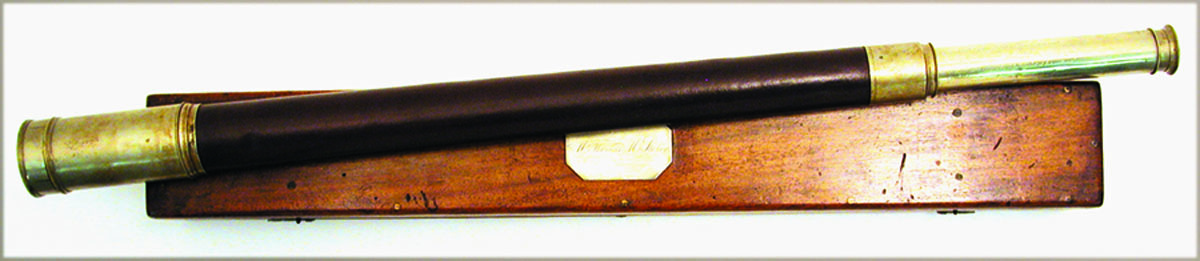 CASED SPYGLASS AWARDED TO THE FIRST MATE OF A BALTIMORE SHIP. Two-draw telescope with engraved inscription on draw tube "Presented by the British Government/to/Mr. Thomas Stocker/first mate of the American Ship "Ann E. Hooper"/of Baltimore in acknowledgment of his gallant/conduct in assisting to save the lives of the/Master and survivors of the Crew of the Barque/"Ouzel Galley" of Dublin on the 4th April 1859". Also signed by famous makers "Troughton & Simms/London". All german silver fittings and a leather cover on the tapered barrel. Length closed 26 1/2" extending to 37". Sliding cover for the eyepiece and a removable cap for objective lens. Original, dovetailed, mahogany case with an inset german silver plaque that is beautifully engraved with recipients name "Thomas M. Stocker". Condition overall excellent noting the leather covering on the barrel was restored a long time ago. Have a copy of an article published in the May 7, 1859 "Baltimore Sun" that describes the incident and specifically mentions Stocker.