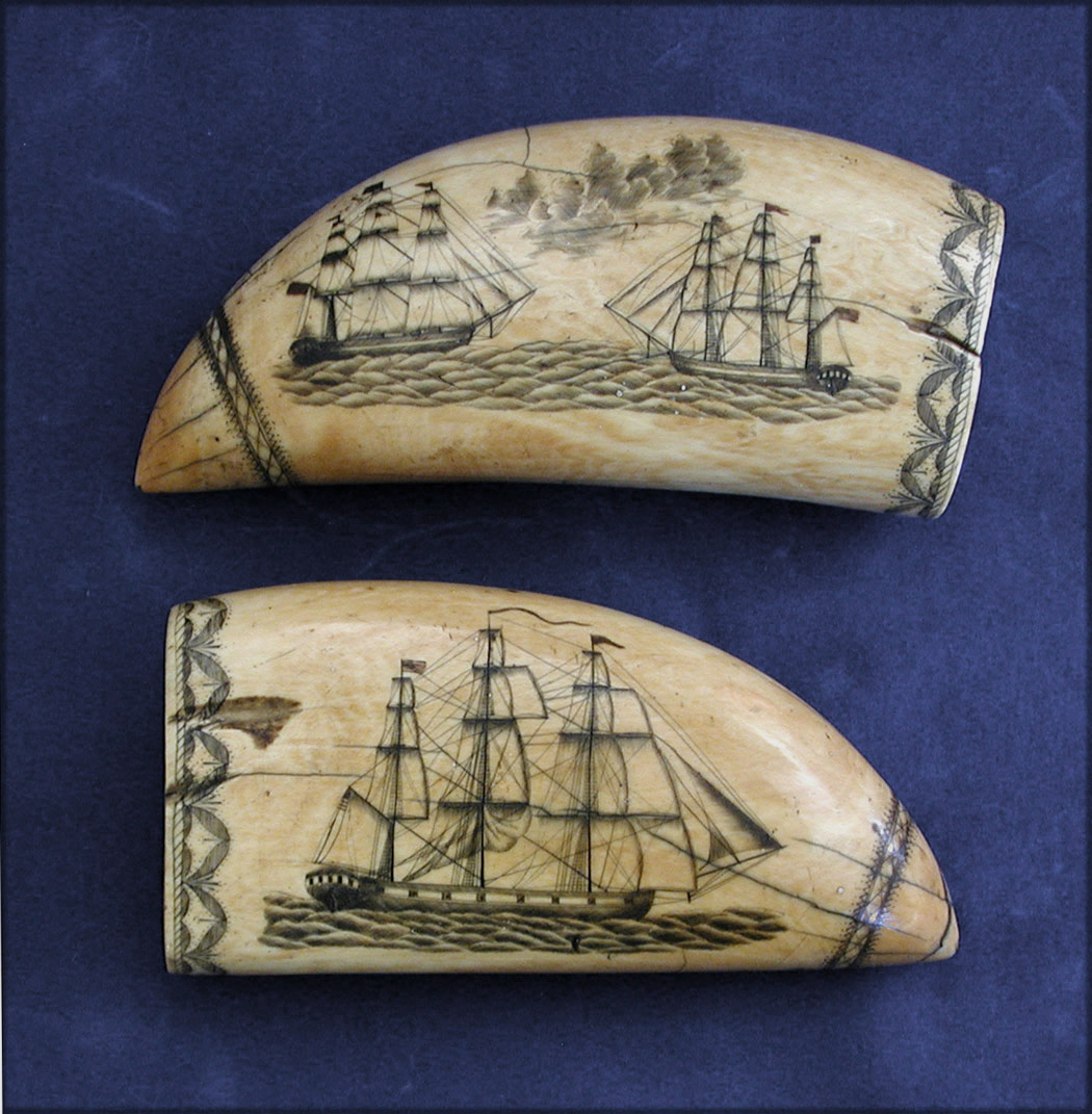 SUPERB PAIR OF SPERM WHALE TEETH PROFUSELY ENGRAVED BY THE ARTISAN REFERRED TO AS "THE BANKNOTE ENGRAVER". Fronts of both with lovely garden scenes depicting a well dressed young man courting a woman likely with the hope of marriage. Each scene fully framed within an elaborate array of floral and filigree motifs. Circling the tip and base are the artist's trademark filigree designs. The reverse of the tooth with the seated lady beautifully engraved with a depiction of two ships under sail, one with an American flag. The reverse of the other with a large starboard view of an American ship under sail. 6" h. x 2.75" w. Teeth with cut bases and are now completely solid. Condition fine with just typical sound age cracks scattered throughout. Magnificent age color over their entire surfaces. Exhibited in 2022 at the Cahoon Museum on Cape Cod. Illustrated on pages 143 & 144 in Alan Granby's book "Wandering Whalemen And Their Art". From my personal collection.