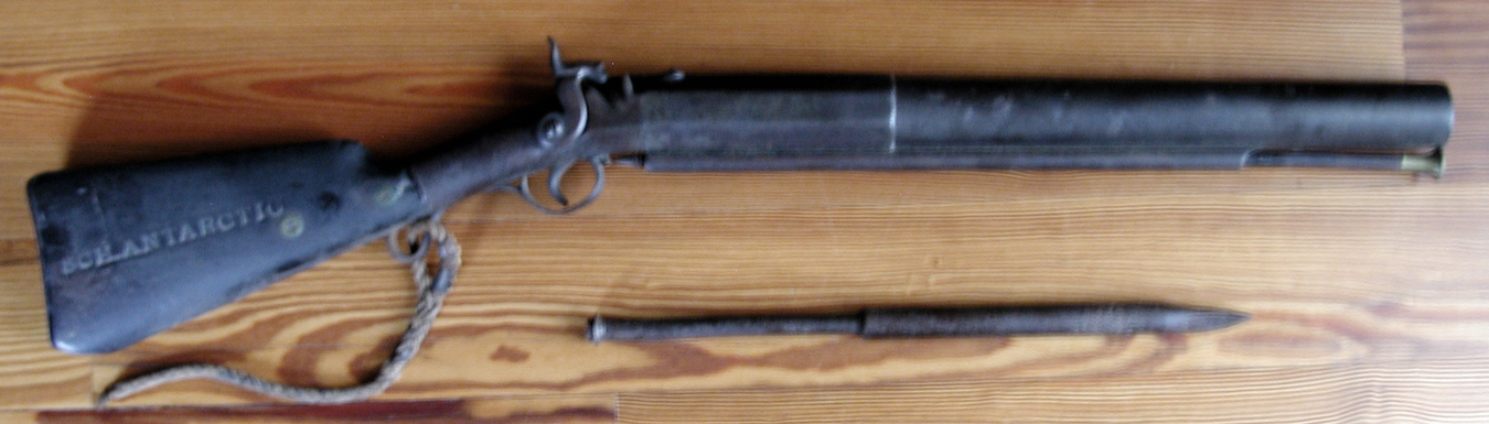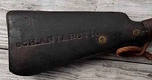 WOOD STOCK BRAND WHALING GUN WITH VESSEL'S NAME "SCH. ANTARCTIC" deep stamped into one side of the stock. Number 1 model with a 20" long octagonal/round barrel and 7/8" bore. Overall length 35 3/4". weighs 16 pounds. Front sight. At the rear of the trigger guard is an iron lanyard loop that still has a section of working lanyard line attached to it. Iron butt plate at the rear of the stock. Brass tipped ramrod with screw at opposite end. Includes a bomb lance that no longer has its rubber fins. Overall condition very good and probably just as it was when taken out of commission. The schooner Antarctic had a long career sailing out of Provincetown, Mass. Starbuck lists 17 Atlantic voyages between 1851-1876, most being quite productive. It's very, very rare to find a whale gun with AUTHENTIC vessel markings. From my personal collection.
