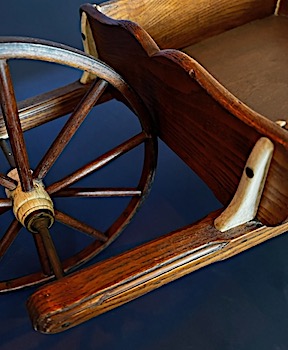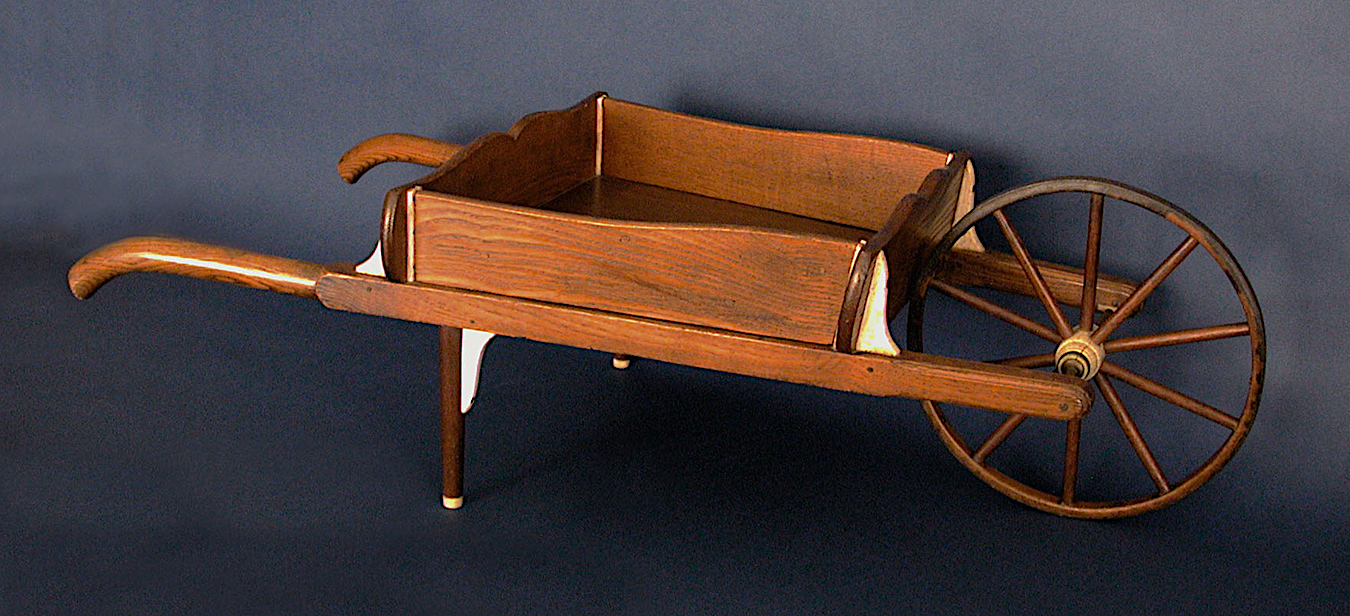 BEAUTIFULLY MADE CHILD'S WHEELBARROW constructed using whalebone, oak and mahogany woods. Masterfully made with a 9" d., metal banded, spoked wheel that has a solid whalebone hub that is somewhat barrel shaped and reinforced on each end with metal bands. There are six whalebone, knee shaped, brackets that strengthen the two rear legs and the upper tub. The bottom of the legs are also tipped with whalebone. The sides of the carrying tub are removable as they slide in or out of four whalebone slots. The 27" long curved handles and arms that hold the wheel axle are each made from single pieces of oak. Overall length of unit is 31". Height is 9" and maximum width being 13". Condition superb. Lovely age color throughout. Has a nice history going back to the early 1960's when it appeared in a marine catalog issued by Samuel Lowe, Jr., Boston MA. Also was in the Barbara Johnson and Jefferey Cohen collections. It has been exhibited at The Smithsonian Institute and Mystic Seaport Museum. I can't emphasize enough what a wonderful example of 19th century scrimshaw this item is. From my personal collection.