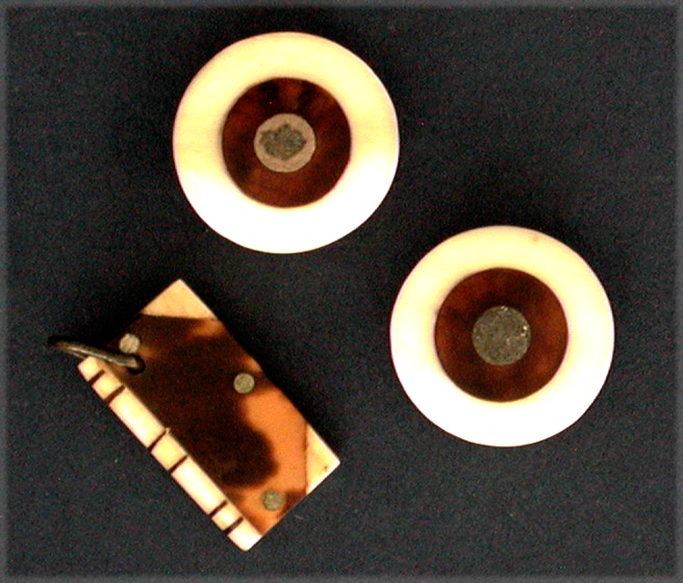 19TH CENTURY SCRIMSHAW JEWELRY in the form of cufflinks and a bracelet charm. Both pieces beautifully made with the cufflinks carved from whale ivory in the form of a pulley sheave that is inlaid on the top with silver and tortoise shell discs. 7/8" diameter. The book charm carved from bone that is inlaid both sides and on the binding with tortoise shell. The shell on each cover fastened using 3 silver pins. 1" high plus the attachment ring at the top. Attributed to Walter C. Van Horn. See Stuart Frank's article on this maker in Volume 8, No 3 of the "Scrimshaw Observer". From my personal collection.