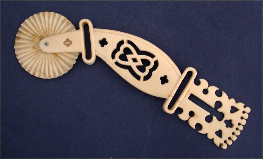 PIE CRIMPER WITH CO-MINGLED HEARTS pierce carved in the center of the handle. Handle and wheel arms made from a single slab of walrus ivory. End portion also carved with hearts, cross and other intricate designs. Overall length 7". Diameter of the serrated wheel 2". Condition excellent. Ex collection Bill Boylhart.