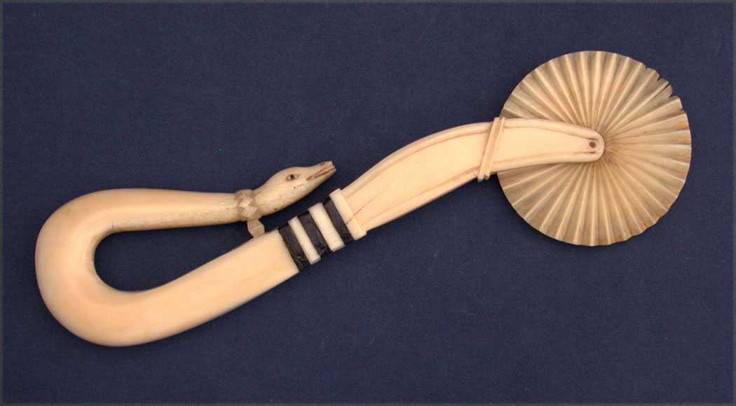 SCRIMSHAW PIE CRIMPER with handle carved in classic serpent motif. Rear portion of handle made from walrus ivory while front section and wheel arms appear to be whale ivory. Handle joined together using 5 alternating baleen and whale ivory spacers. Length 6 3/4". Diameter of serrated wheel 2". Condition very good noting that one wheel arm is mended but done so using the original piece. Circa 1840.