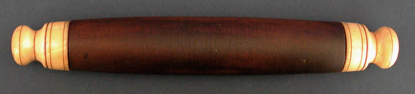 WOOD AND WHALE IVORY SCRIMSHAW ROLLING PIN. Believe the center rolling section made from teak wood that has acquired a deep age patina. Large turned, whale ivory, handles each decorated with five incised lines. Overall length 14". Condition excellent. Whale ivory with desirable yellow age color. Circa 1840. Very nice.