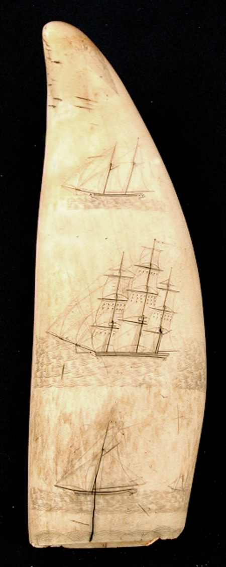 SPERM WHALE TOOTH DECORATED WITH PORT VIEWS OF THREE SAILING VESSELS. In the center is a ship under sail with pilot boats depicted above and below it. The very tip wrapped with a sawtooth motif. Finely engraved. Reverse with different designs and buildings that are quite worn probably from the tooth laying on that side for 150+ years. Tooth condition good. Light, even age color throughout. 6"h x 2 1/4" w.