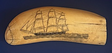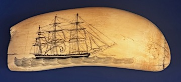 SPERM WHALE TOOTH DECORATED BOTH SIDES WITH SHIP PORTRAITS. One side with a quality rendering of the starboard view of a ship under full sail. Very detailed work even depicting men on board. Sails and rigging extremely well done. The reverse with a port view of another ship under sail. Quite a large and heavy tooth that measures 7 3/4" long x max width of 2 3/4". Weighs a full two pounds. Condition overall excellent.