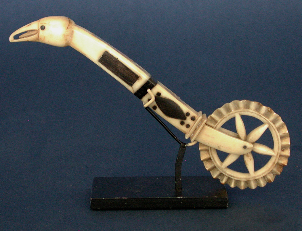 WHALE IVORY SCRIMSHAW PIE CRIMPER with a carved Eagle head at the end of the handle. Wheel arms, handle and Eagle all made using 2 pieces of whale ivory and baleen spacer where two sections join. The four sides of the handle inset with 16 pieces of baleen, mother of pearl and abalone shell in the form of rectangles, diamonds, half circle, dot and shield designs. Inset baleen discs for Eagle's eyes and some red coloring in the mouth and beak area. Nice, open carved, whale ivory, serrated wheel in the form of star shaped spokes. Wheel diameter 2". Overall length 6 3/8". Condition excellent. Comes with a custom metal display stand. Has a nice provenance dating back to the 1920's. Once part of the collection of the New Bedford Whaling Museum's first curator, Frank Wood. Illustrated in Old Dartmouth Historical Society 1957 publication where they included a much earlier photo of the Wood crimper collection. Also was part of the Frederck H. Howell crimper collection(formed in the early 1900's) which I handled and illustrated in my 1984 catalog #18, item #51.