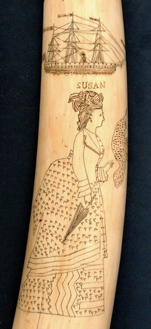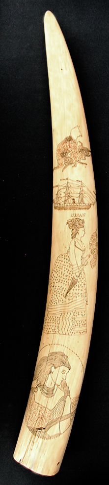 LARGE SIZE SCRIMSHAW CARVED WALRUS TUSK. One side engraved with four scenes that include a female portrait within an oval frame, full female portrait of a lady holding a parasol while reaching out to a bird. Above her head is the name "SUSAN". Above her name is a starboard view of a steam and sail ship that is flying 3 banners and a flag off the stern. The top with an image of a cat with several kittens. Has red polychrome coloring scattered throughout. 24" long. Fine condition. Nice age yellow patina. Circa 1860.