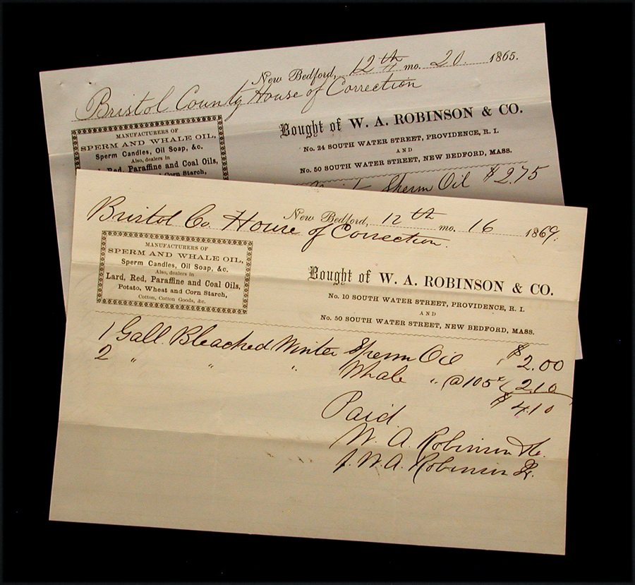GROUP OF NINE 19TH CENTURY RECEIPTS FOR THE PURCHASE OF SPERM WHALE OIL AND CANDLES. All from the well known firm W. A. Robinson who operated shops in New Bedford and Providence, RI. Dated during the 1860's. Some printed and executed on blue paper and the rest on ivory colored stock. Each invoice pre printed with dealer info and then executed in excellent hand writing using fountain pen. 5 1/4" x 8". All in excellent condition. Display nicely when mixed in with your scrimshaw collection. Sold as a lot.